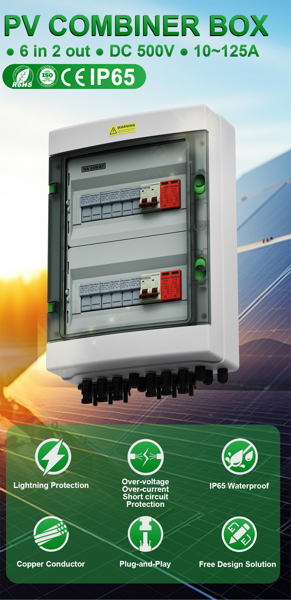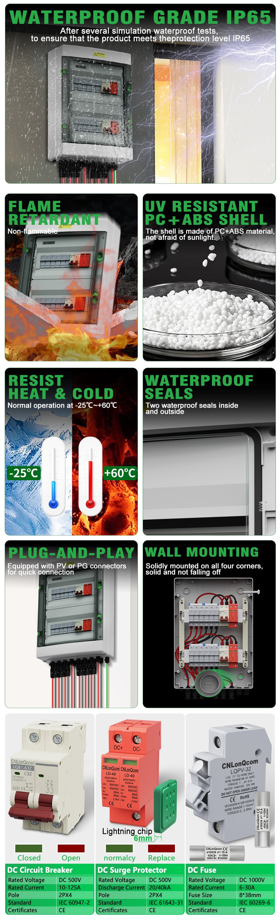CNLonqcom's HA Series Plastik PV Combiner Box 4 in 1 Out DC500V mempunyai kes kalis air PC+ABS dengan pembinaan tertutup, perlindungan beban, perlindungan litar pintas, perlindungan overvoltage, habuk, kelembapan dan perlindungan kilat.